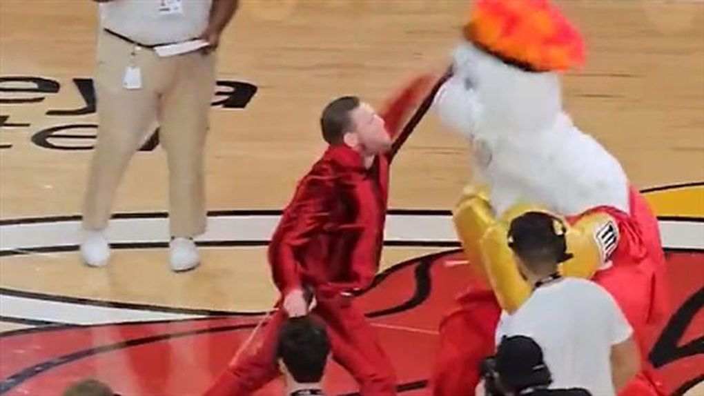 Num sketch obviamente ensaiado, o lutador deparou-se com Burnie, a mascote do Miami Heat, que com umas luvas de boxe douradas o desafiava para um combate.
