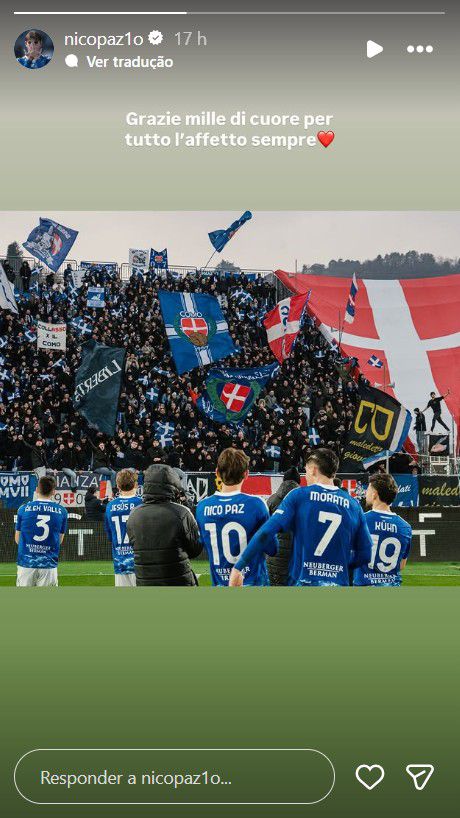 O apoio não se limitou ao relvado. Os adeptos do Como entoaram o nome de Nico Paz mesmo após o falhanço, um gesto que o jogador agradeceu mais tarde nas redes sociais. «Obrigado do fundo do meu coração por todo o carinho de sempre», escreveu.