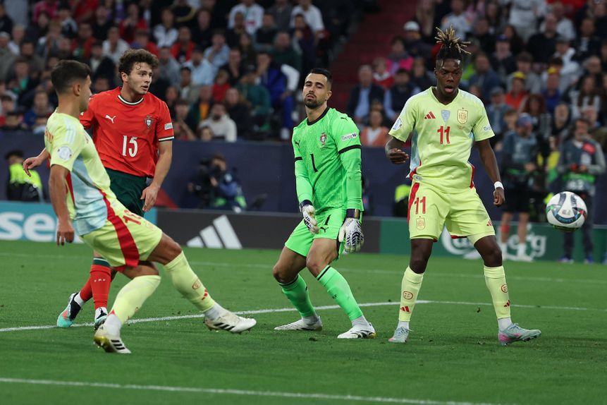 A final da Liga das Nações não começou bem para Portugal. Aos 21', a Espanha colocou-se a vencer, com Zubimendi a concluir uma jogada confusa, que passou por Oyarzabal e Pedri, antes de chegar a Yamal, que cruzou para dentro de área.