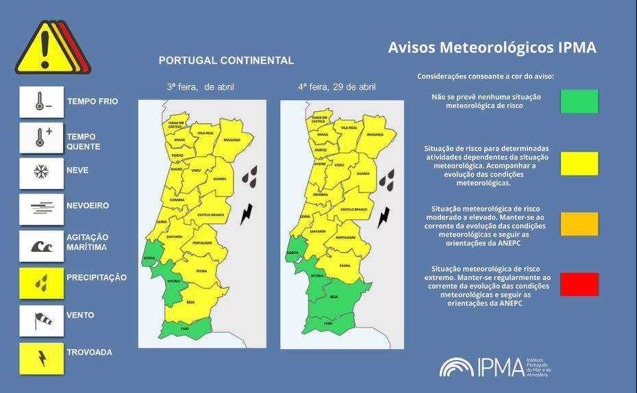 Mais a norte — Viana do Castelo, Braga, Vila Real, Bragança, Guarda, Viseu, Porto, Aveiro, Coimbra e Castelo Branco — o alerta do IPMA prolonga-se até às 21 horas, devido a precipitação e trovoada.