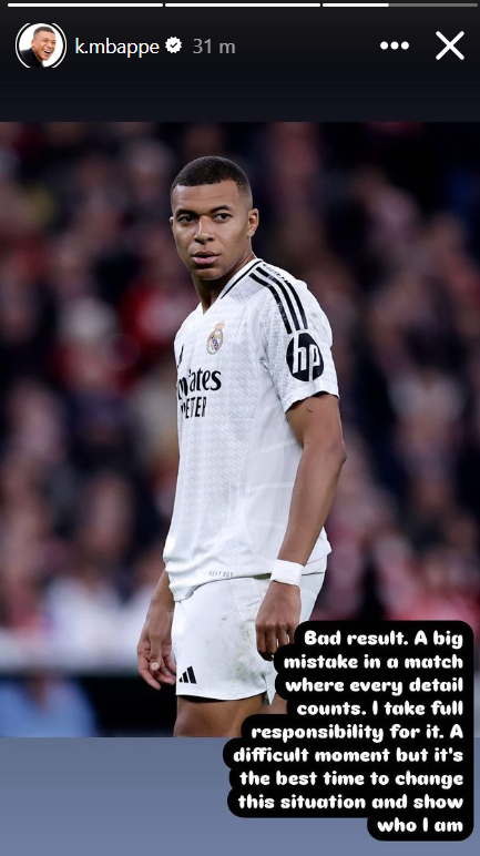«Mau resultado. Um grande erro num jogo em que todos os detalhes contam. Eu assumo toda a responsabilidade por isso. É um momento difícil, mas é a melhor altura para mudar a situação e mostrar quem sou», escreveu.