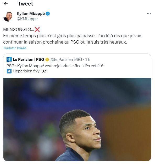 Kylian Mbappé, que, esta terça-feira, enviou um comunicado à agência AFP em que garante nunca ter negociado uma renovação com o PSG e que informou o clube, em julho de 2022, da sua vontade de não exercer a cláusula unilateral que lhe permitia estender o contrato por mais uma época, até 2025, partilhou uma notícia do Le Parisien, que dava conta do interesse do internacional francês em rumar ao Real Madrid já neste verão.