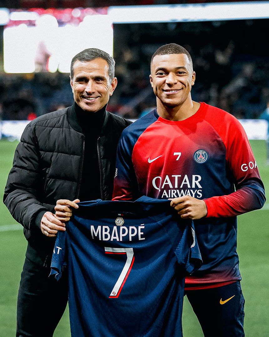 Eis o momento em que o ex-goleador do PSG e antigo internacional português Pedro Pauleta presenteia Mbappé com a camisa do Top Scoreur.