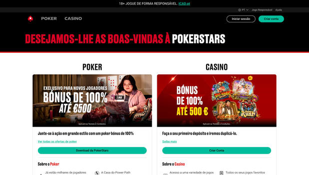 PokerStars | Bónus de 100% até 500€ no primeiro depósito | Slots, jogos de mesa, poker | iOS e Android |