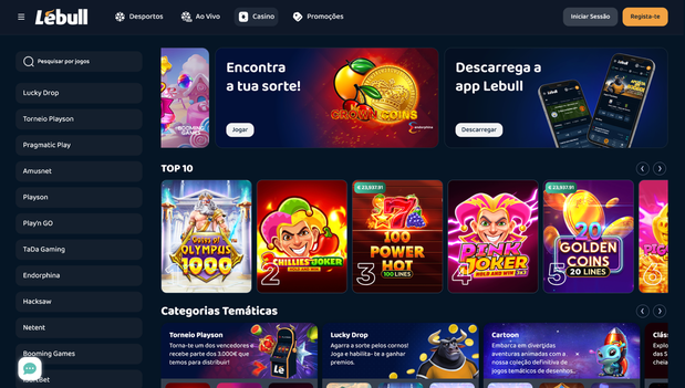 O Lebull Casino oferece uma seleção variada de slots, sendo este o único tipo de jogo disponível. Mesmo assim, o jogador encontra uma plataforma muito interessante, com um ambiente de casino dividido em diferentes categorias. Entre elas encontra Novidades, Mais Populares, Pragmatic Play, Playson, entre outras.