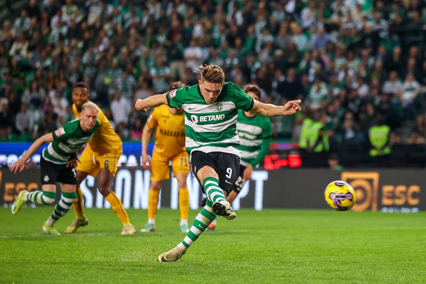 Gyokeres a concretizar a grande penalidade e a chegar ao hat-trick (JOSE SENA GOULAO/EPA)