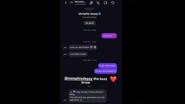 Memphis enviou uma mensagem privada ao artista, que conta com mais de dez milhões de seguidores no Instagram. Oruam partilhou uma captura de ecrã da mensagem que recebeu do neerlandês. «Mantém-te forte nestes tempos de stress. Vocês podem salvar as crianças e a nova geração», escreveu o antigo jogador do Barcelona e do Manchester United.