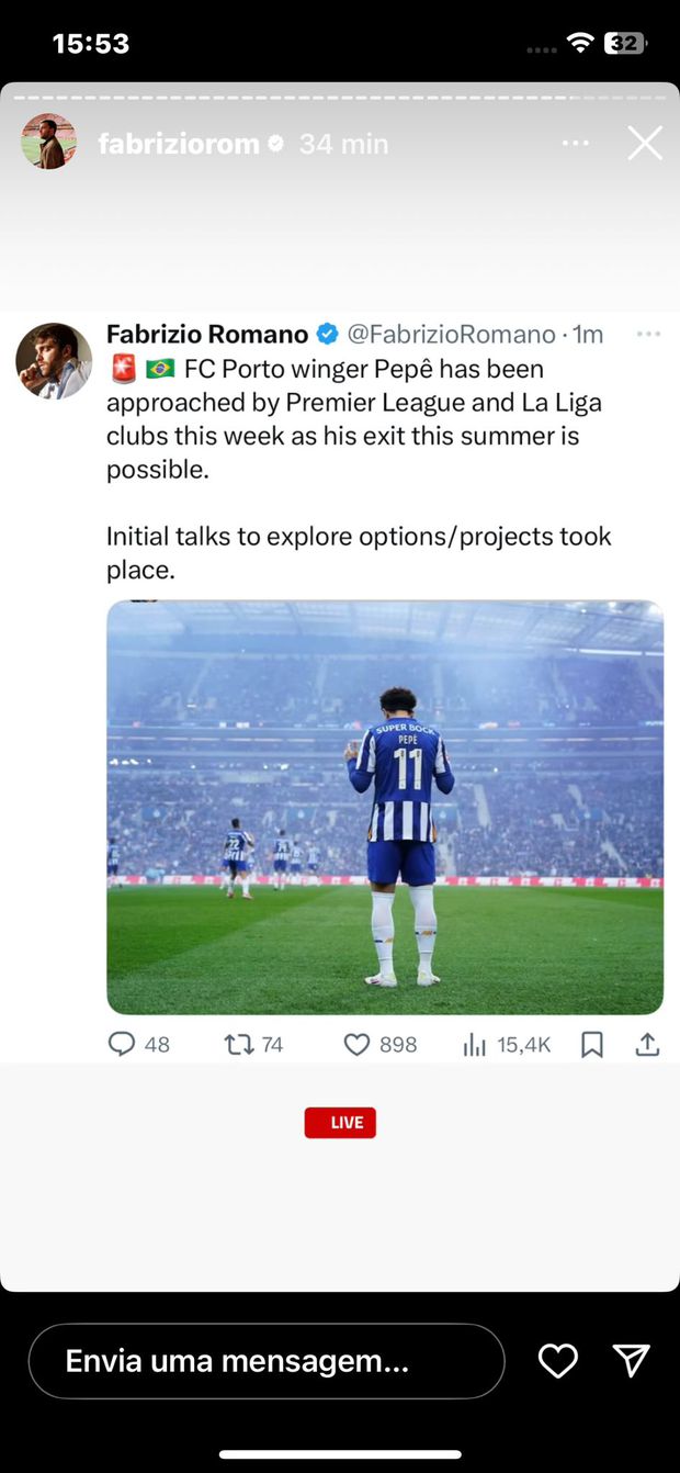 Já esta tarde, Romano dedicou uma das suas publicações nas redes sociais ao extremo brasileiro dos dragões, afirmando que o camisola 11 está a ser seguido por clubes ingleses e espanhóis, adiantando mesmo que a saída de Pepê no durante este verão é uma hipótese realmente em aberto.