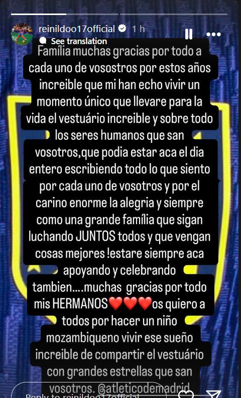 Reinildo despediu-se também do clube espanhol: «Família, muito obrigado por tudo a cada um de vós por estes anos incríveis que levarei para toda a vida. Podia estar aqui o dia todo a escrever tudo o que sinto por cada um de vocês e pelo enorme carinho. A alegria e sempre como uma grande família que continuam a lutar todos juntos e que coisas melhores virão. Eu estarei sempre aqui a apoiar e a festejar também. Muito obrigado por tudo meus irmãos, adoro-vos a todos por terem feito um rapaz moçambicano viver esse sonho incrível de partilhar o balneário com as grandes estrelas que vocês são.»
