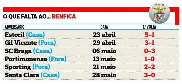 A título de curiosidade e fazendo o exercício simples de somar aos seis jogos que faltam os mesmos exatos resultados que se registaram na primeira volta nesta fase (quatro vitórias, um empate e uma derrota) a equipa encarnada somaria mais 13 pontos, ou seja chegaria aos 84 pontos. Meta que poderia não ser suficiente para dar título caso o FC Porto vença todos os seis jogos que tem pela frente, ou seja somando 18 pontos aos atuais 67, terminaria com 85 pontos, um à frente dos benfiquistas.