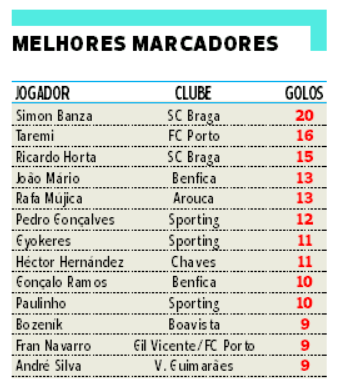 Melhor marcador nos três últimos anos da Liga (2020, 2021 e 2022), Mehdi Taremi (Bola de Prata em 2022/2023) foi 2.º (16 golos), pois só marcou três vezes na atual edição da prova. Tal como em 2022, o pódio encerra com Ricardo Horta que, como Pedro Gonçalves, surge pelo quarto ano seguido entre os maiores goleadores do ano.