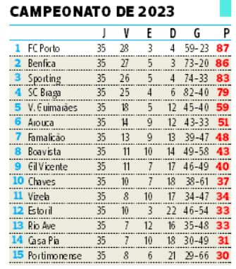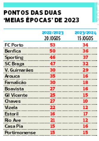 Com a diferença do número de jornadas cumpridas nas duas meias Ligas de 2023 (20 da época passada contra 15 da atual) é natural que, com menos 15 pontos em disputa, as equipas apresentem agora inferior pontuação. Mas esse não é, em absoluto, o caso de Estoril e Casa Pia (ambos fizeram agora mais um ponto e os gansos até venceram mais um jogo!) ou até do Portimonense, que fez os mesmos 15 pontos. Menção negativa, isso sim, para o FC Porto (menos 19 pontos contabilizados), que perdeu apenas um jogo nos 20 realizados na segunda metade de 2022/23 e sofreu três desaires nos 15 desta época.