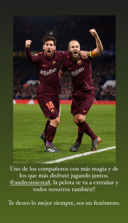 «Um dos companheiros de equipa com mais magia e um daqueles com quem mais gostei de jogar. Andrés Iniesta, a bola vai sentir a tua falta e todos nós também. Desejo-te as maiores felicidades, és um fenómeno», lê-se na mensagem de Messi.