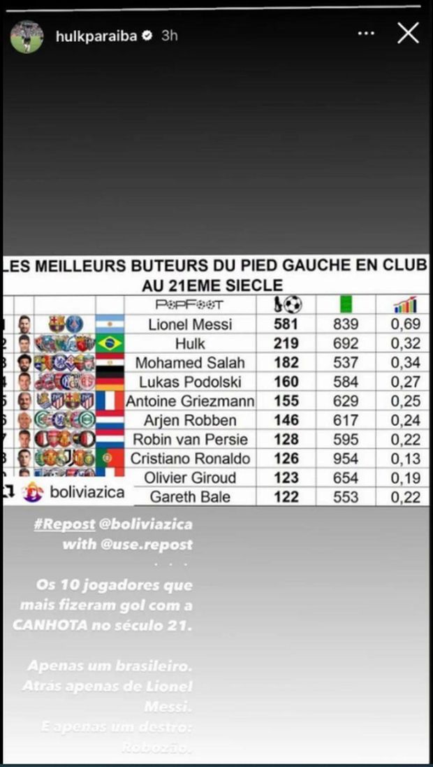 O site francês PopFoot elaborou um ranking onde destaca os jogadores que mais golos marcaram com o pé esquerdo no Século 21. Estatística onde Hulk surge no segundo lugar, superado apenas por Lionel Messi.