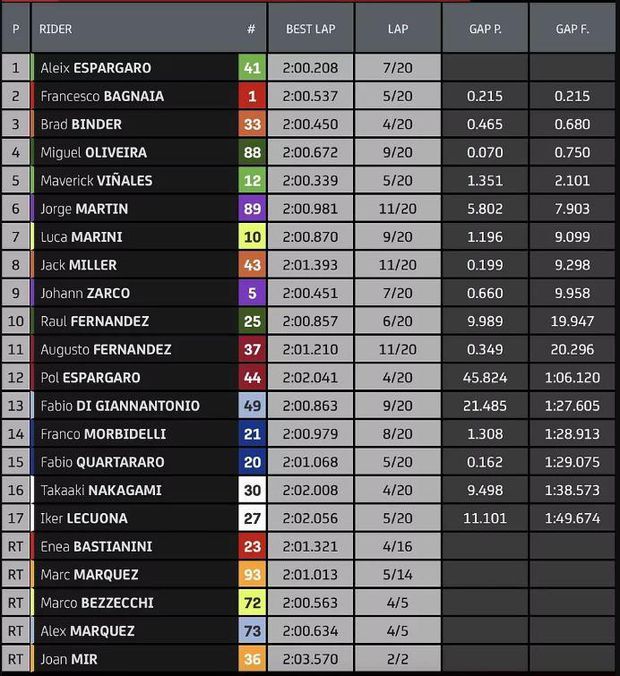 Emoção até ao fim também na luta pelo primeiro lugar, com o espanhol Aleix Espargaró (KTM) a ultrapassar italiano Francesco Bagnaia (Ducati) na última volta e a assegurar a vitória.