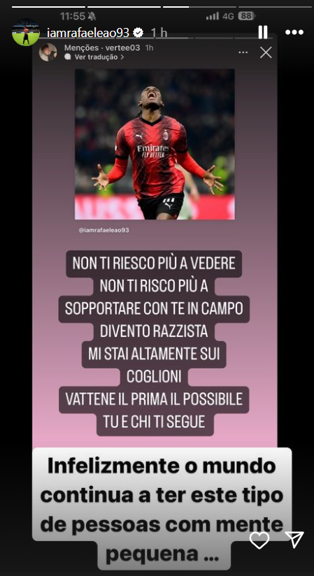 «Não aguento mais ver-te em campo, estou a tornar-me racista e estás-me a irritar. Sai o mais rápido possível, tu e quem te segue», escreveu o adepto, com o internacional português a partilhar a mensagem e a responder: «Infelizmente, o mundo continua a ter este tipo de pessoas com mente pequena.»