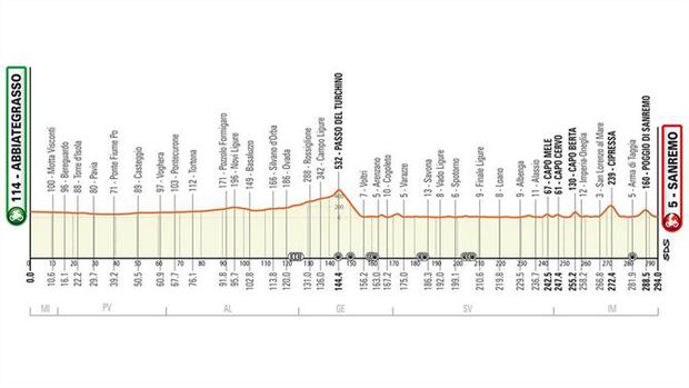 Este ano e pela primeira vez em 114 edições a corrida não começa em Milão e tem inicio em Abbiategrasso, uma localidade a cerca de 25 km, seguindo em direção a Pavia onde entra no percurso original. As principais dificuldades situam-se nos últimos 50 km, com destaque para a subida a Cipressa com cerca de 5,6 km de extensão com uma inclinação de 4,1%, situada a 20 km da meta. Segue-se uma descida muito técnica e a subida de Poggio Sanremo que começa a 9 km do final, com a extensão de 3,7 km e uma desnível médio de 3,7%, numa estrada estreita com curvas fechadas até à entrada de San Remo, a ultima curva fica situada a 750 metros da linha de chegada instalada na Via Roma.