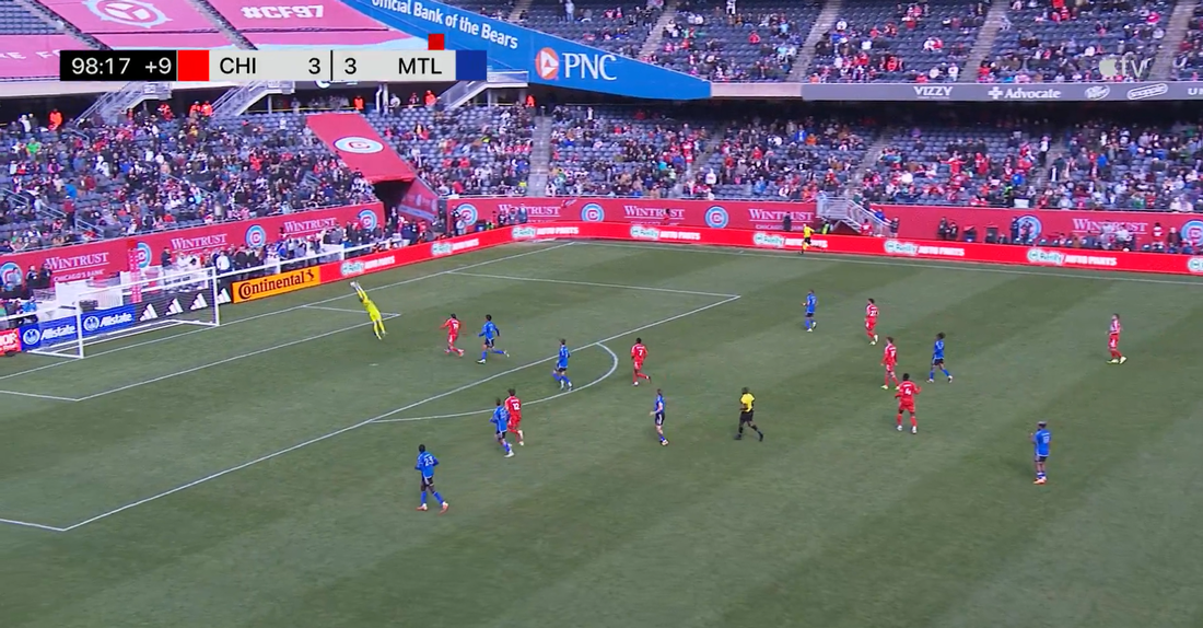 O Chicago Fire estava empatado a três bolas com o CF Montréal, que estava reduzido a dez jogadores, quando, a segundos do fim da partida, Kellyn Acosta tentou cruzar para a grande área adversária, atrás da linha de meio-campo, e… resultou (diretamente) em golo.
