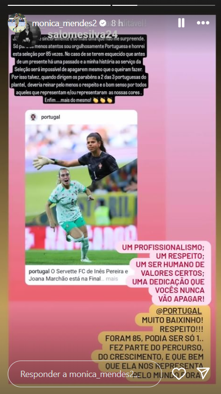 «Já vi de tudo e sinceramente é só mais uma que não me surpreende. Só para os menos atentos sou orgulhosamente portuguesa e honrei esta Seleção por 85 vezes. No caso de se terem esquecido que antes de um presente há um passado e a minha história ao serviço da Seleção será impossível de apagarem mesmo que o queiram fazer. Por isso talvez, quando dirigem os parabéns a 2 das 3 portuguesas do plantel, deveria reinar pelo menos o respeito e o bom senso por todos aqueles que representam e/ou representaram as nossas cores. Enfim... mais do mesmo», escreveu, nas redes sociais.