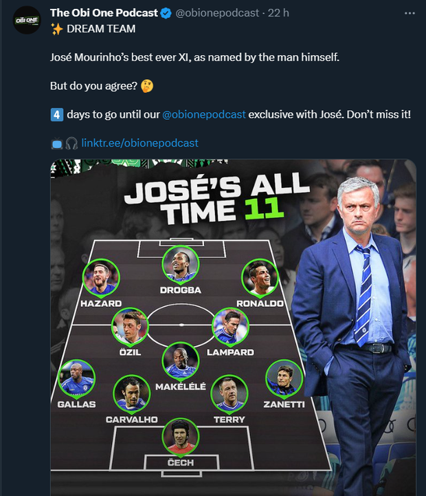 O podcast The Obi One, do antigo jogador Jon-Obi Mikel, promete para a próxima segunda-feira uma entrevista realizada a José Mourinho. Assim, durante esta semana, o programa tem promovido a entrevista nas suas redes sociais e uma das formas de fazê-lo foi divulgar o melhor onze inicial de sempre escolhido por Mourinho. Contudo, o treinador português não demorou a desmentir a publicação.