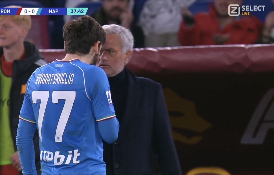 José Mourinho enfrentou este sábado Khvicha Kvaratskhelia em pleno relvado do Olímpico depois de ver dois jogadores seus verem o cartão amarelo na sequência de jogadas do georgiano do Nápoles. «Basta! Não sejas tão m***das», terá dito o treinador português da Roma, de acordo com a DAZN italiana, antes de colocar as mãos na cara do avançado e de falar com ele de uma forma mais tranquila. Viu o cartão amarelo.