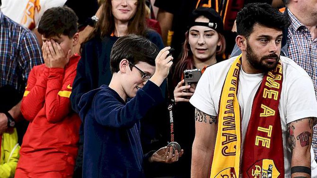 Depois de ter passado pelo palco e recebido a medalha de finalista na competição, José Mourinho ofereceu-a, lançando-a na direção de um jovem adepto da Roma.