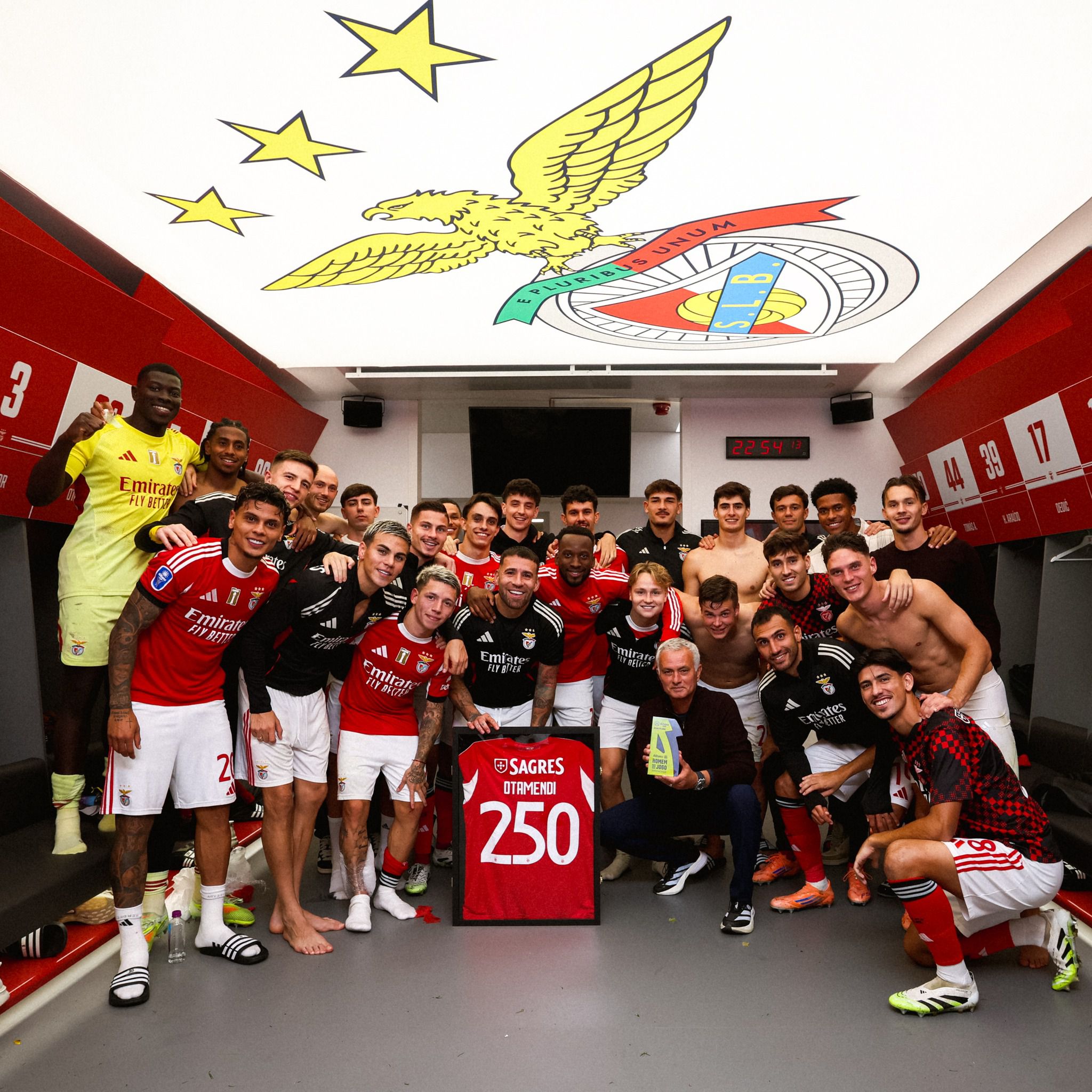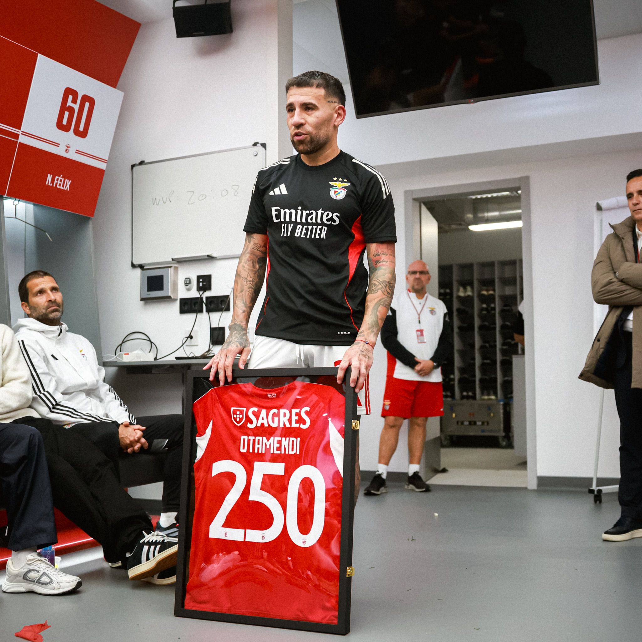 O técnico começou por assistir, sentado entre os jogadores, ao momento em que o presidente Rui Costa entregou a Otamendi uma camisola emoldurada com o número 250 nas costas.