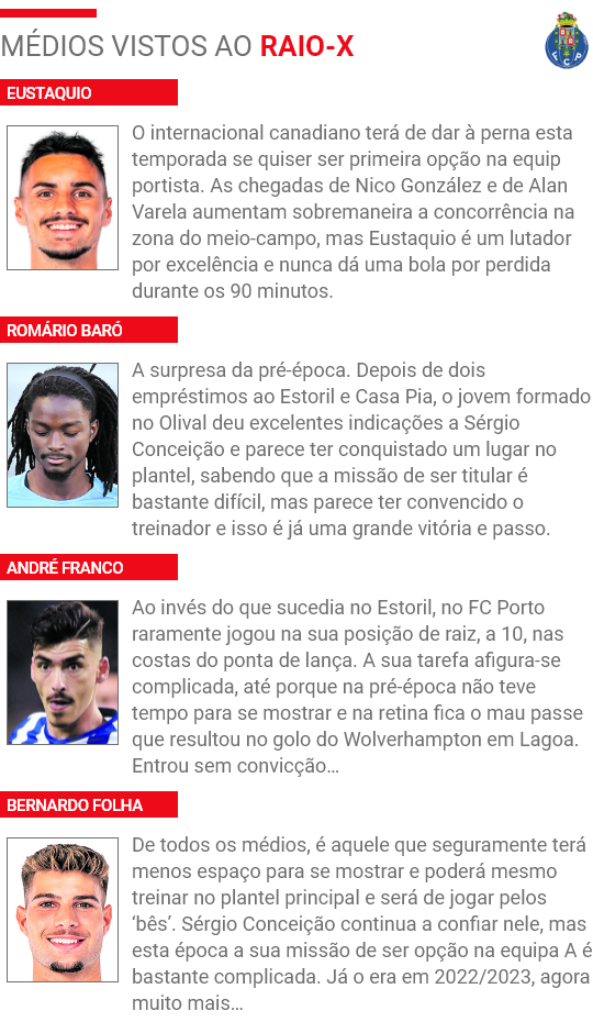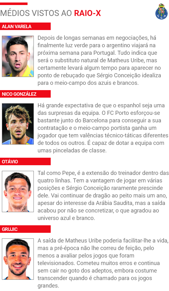 À partida para a nova temporada, Sérgio Conceição terá à sua disposição oito médios, a saber: Nico González, Alan Varela, Otávio, Grujic, Eustaquio, Romário Baró, Bernardo Folha e André Franco. É um número elevado, sendo que na maior parte das vezes apenas três terão lugar assegurado no onze, partindo do pressuposto que o FC Porto se manterá a jogar no tradicional 4x4x2, embora por vezes possa variar num 4x3x3 ou num 4x2x3x1.