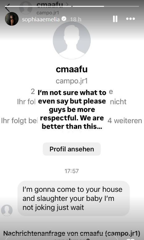 Nas últimas horas, Sophia publicou mensagens que recebeu no domingo à tarde, ameaçando-a e à sua família. «Espero que tenhas um aborto» e «Vou a tua casa matar o teu bebé, não estou a brincar» foram as duas mensagens publicadas pela mulher do jogador.