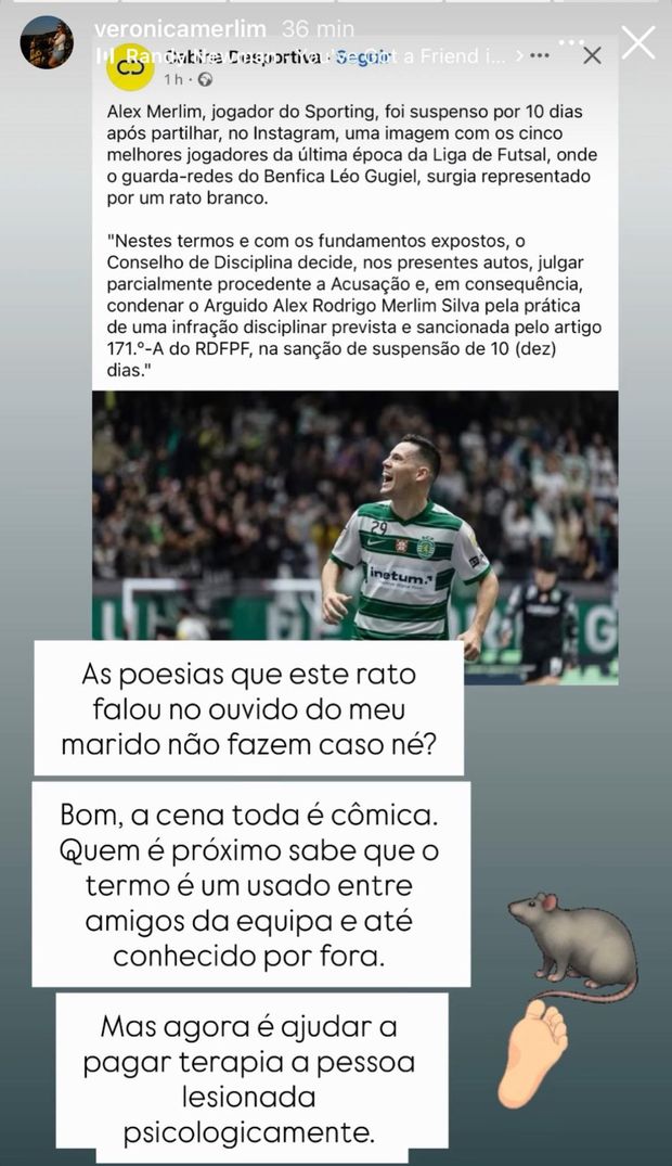Verónica Merlim, mulher de Alex Merlim, reagiu esta segunda-feira com ironia ao castigo do Conselho de Disciplina da FPF aplicado ao jogador de futsal do Sporting por ter utilizado a imagem de um rato como referência ao guarda-redes do Benfica Léo Gugiel.