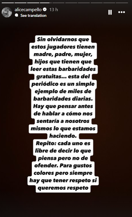 "Odeio fazer-me de vítima e criar mais polémica, mas isto não me parece normal, desculpem. É normal? A única coisa que vejo como nível baixo é ser jornalista, ter estudado para isso e escrever um título destes quando Espanha está a um dia de jogar uma meia-final. Fico estupefacta que em vez de tentarem animar um jogador se dediquem a mandá-lo abaixo... como acham que uma pessoa pode dar o máximo pelo seu país quando sente que não acreditam nele? O que querem com este título? Aumentar o ódio contra uma pessoa? Parabéns, cada um pode escrever a sua opinião e é livre de expressá-la e nunca se agradará a todo o mundo, mas há formas e formas de dizer as coisas, sobretudo quando és um jornalista e tens tanto poder de influenciar os jovens. A sério que queremos isto? Há que ser melhor pessoa e não normalizar este tipo de coisas, seja com o Álvaro ou com outra pessoa», escreveu no Instagram.