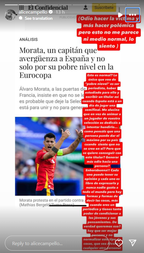 Alice Campello usou as suas redes sociais para reagir a um artigo do El Confidencial intitulado «Morata, um capitão que envergonha Espanha e não apenas pelo seu baixo nível no Euro», questionando a tentativa de gerar mais ódio em torno do jogador e de «mandá-lo abaixo» em vez de «animá-lo» antes do jogo das meias-finais do Euro com França.