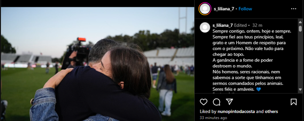 «Sempre contigo, ontem, hoje e sempre. Sempre fiel aos teus princípios, leal, grato e um Homem de respeito para com o próximo. Não vale tudo para chegar ao topo. A ganância e a fome de poder destroem o mundo. Nós homens, seres racionais, nem sabemos a sorte que tínhamos em sermos comandados pelos animais. Seres fiáveis e amáveis», escreveu Liliana Conceição nas redes sociais.