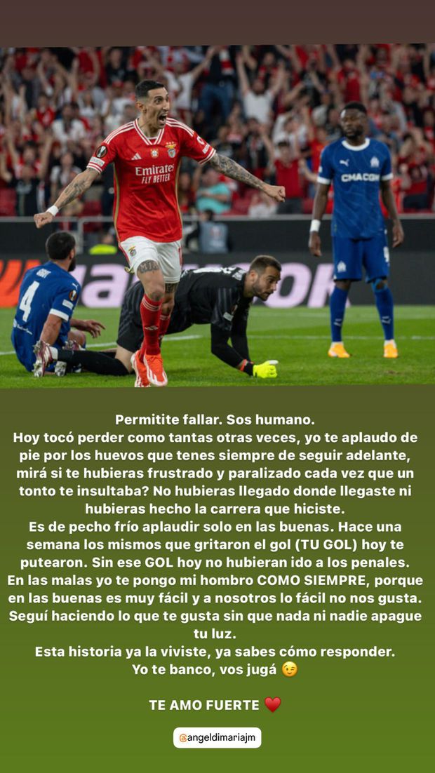 «É fácil aplaudir só nos bons momentos. Os mesmos que há uma semana gritaram o teu golo [marcou o 2-0 na Luz], hoje assobiaram-te. Sem esse golo não tinham ido aos penáltis. No maus momentos eu estou sempre do teu lado, nos fáceis é fácil e nós não gostamos do que é fácil. Continua a fazer o que gostas sem que ninguém apague a tua luz. Já viveste esta história, já sabes como responder, Eu apoio-te, tu jogas.»