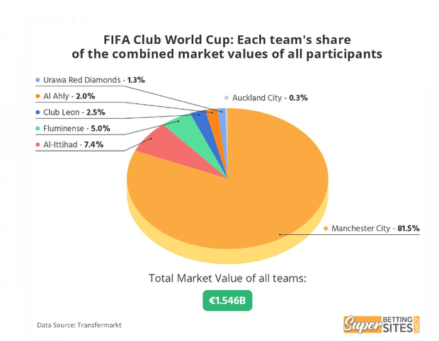 E se somarmos o valor de mercado dos sete participantes na prova deste ano, ao Manchester City cabe uma fatia colossal de 81,5 por cento. Os plantéis de todos os clubes juntos, segundo dados compilados pelo site supperbettingsites.com com base no site transfermarket, valem 1.546 milhões de euros, dos quais 1.260 deles, os tais 81,5 por cento do total, jogam sob as ordens de Pep Guardiola.