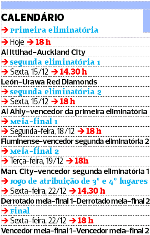 Numa rara má fase, sem Haaland, lesionado recente, nem De Bruyne, lesionado antigo, será que o City dará brechas? O Flu, com Arias, Cano e a obsessão sul-americana de bater os europeus, pode surpreender? Benzema, Kanté, Fabinho e Romarinho, todos já vencedores da prova e a jogar em casa, chegarão para o Al-Ittihad? E ainda há Tau, no Al Ahly, Ambriz, no Léon, o ex-dragão Nakajima, no Urawa, e Howieson, no Auckland, loucos para surpreender. Entretanto, a FIFA entendeu que este modelo em que o clube europeu vale 80 por cento do total dos participantes está esgotado e para a próxima edição, apenas em 2025, está prevista uma revolução. Nos EUA, estarão 32 equipas, das quais 12 europeias, seis sul-americanas, cinco da Concacaf (em virtude de ser a confederação organizadora), quatro africanas, quatro asiáticas e uma da Oceania, com base nos títulos continentais e nos rankings.