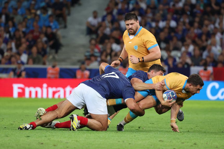 Em Lille, no estádio Pierre-Mauroy, na noite do regresso dos hinos nacionais, no caso em concreto, da Marselhesa (hino francês) e hino uruguaio, ecoados de viva-voz pelo público presente nas bancadas (a primeira ronda do campeonato do mundo ficou marcado por críticas à organização devido à colocação de um coro de crianças – Mêlèe de Choeurs – a cantarem os hinos de cada um dos países), uma renovada seleção gaulesa (3.ª do ranking), com 12 estreantes no XV inicial, passou por alguns sustos e não consegui somar ponto de bónus ofensivo (marcou três ensaios somente) diante Los Teros.