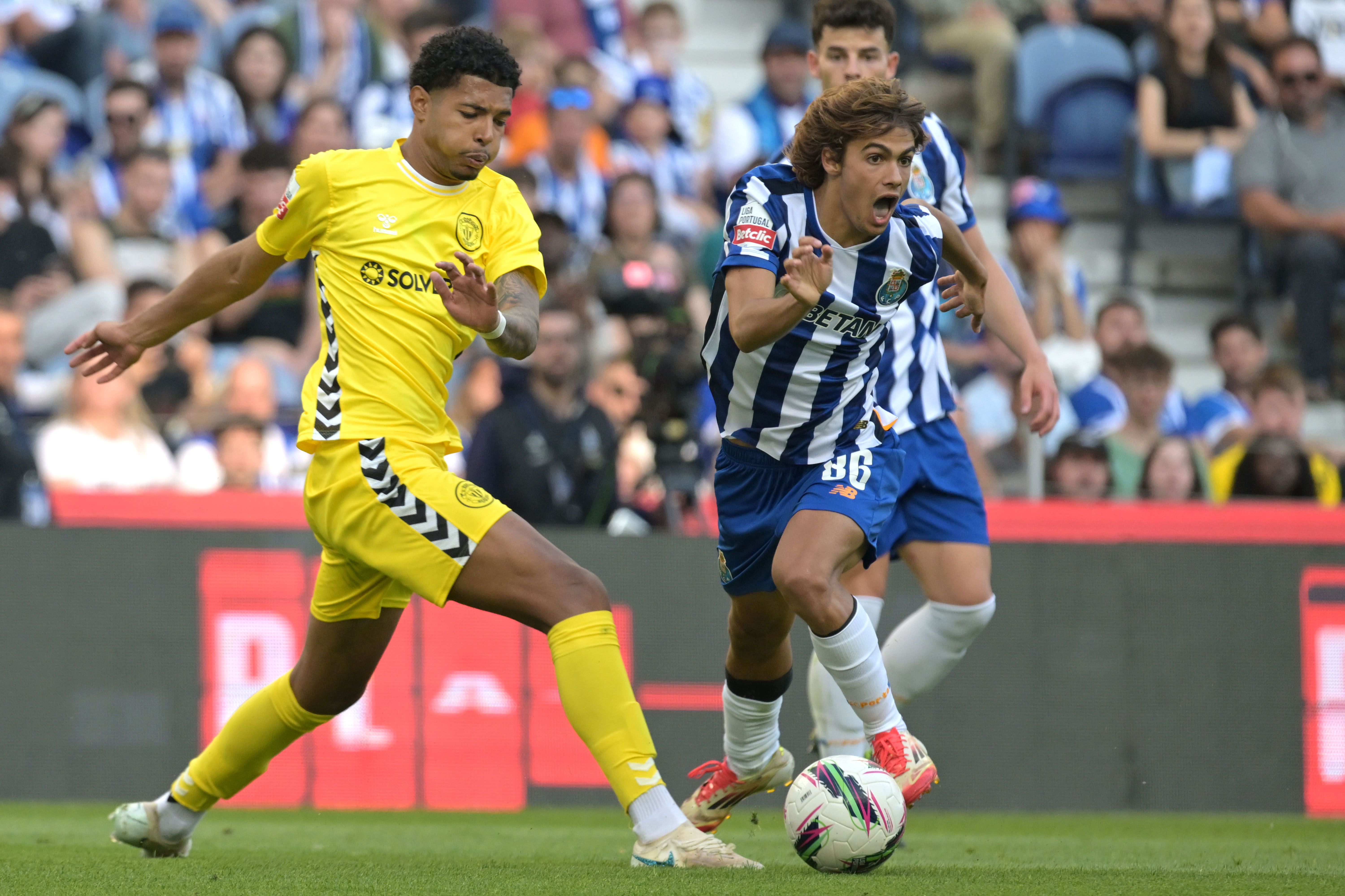 Matheus Dias tenta ultrapassar Rodrigo Mora no jogo com o FC Porto. - Foto: EPA/FERNANDO VELUDO