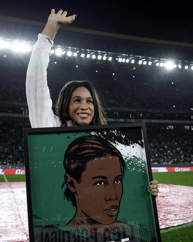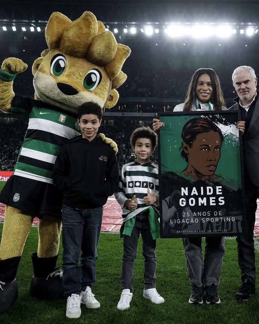 Naide Gomes subiu ao relvado do Estádio José Alvalade para ser homenageada pelos 25 anos de ligação ao clube, uma surpresa que a deixou emocionada, principalmente por estar ladeada pelos filhos.