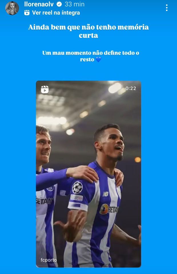 Pouco depois, foi a vez da sua namorada, Lorena Lopes, que esteve a assistir ao encontro ao vivo, deixar uma mensagem no Instagram, defendendo o seu parceiro e mandando uma bicada aos adeptos: «Ainda bem que não tenho memória curta. Um mau momento não define tudo o resto.»