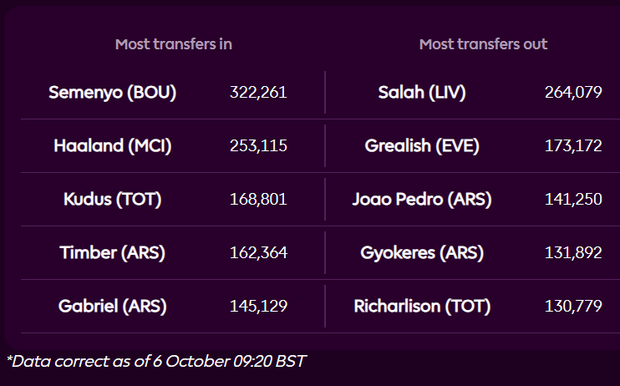 Os jogadores mais comprados e vendidos antes da jornada 8 da Premier League na FPL - Fonte: Premier League