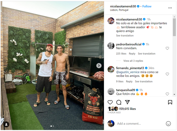 Nicolás Otamendi divulgou uma foto no Instagram na companhia de Ángel Di María. «Não é só o homem dos golos decisivos, mas também o do churrasco. É um incrível 'assador'. Gosto muito de ti, amigo», escreveu o central sobre o compatriota.