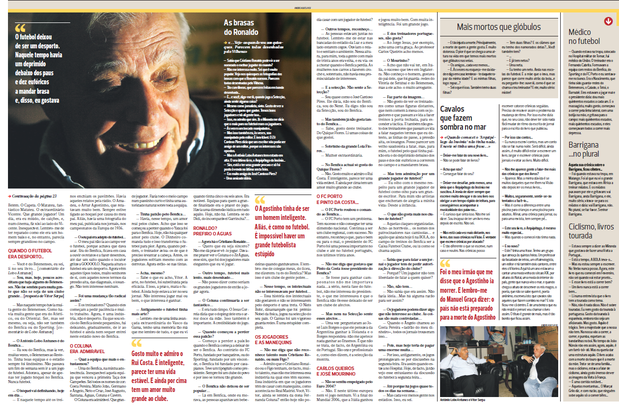 - Admito que o Cristiano Ronaldo ou o Figo tenham, de facto, muito talento, mas não me interessa essa indústria na qual eles têm sucesso. Essa indústria em que os jogadores têm de casar com manequins, como acontecia no Real Madrid. Você, Vítor, ainda se lembra da dona Fernanda Coluna? Então hoje não podia casar com um jogador de futebol?