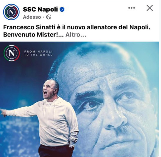 Nas redes sociais o Nápoles vai cometendo erros. O clube anunciou o terceiro treinador da temporada nas redes sociais, mas enganou-se no nome. O emblema publicou a fotografia correta no anúncio – a de Francesco Calzona –, mas escreveu que o novo técnico era Francesco Sinatti (que é sim o novo preparador físico).