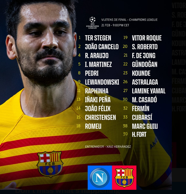 «Temos uma motivação forte e a esperança de passar, mas vamos ter de mostrar do que somos capazes. Há condições para fazer um grande jogo frente a uma equipa que mudou de treinador de forma surpreendente, mas que já conhece o ambiente. Obviamente, não sei como eles abordarão a corrida e qual sistema tático adotarão. Não há favoritos, vamos tentar dominar o jogo como quisermos. Tenho uma sensação boa. A pressão é forte, mas as motivações também. Sabemos que vamos precisar de personalidade contra três atacantes fortes e uma equipa que é campeã de Itália. É difícil parar Politano, Osimhen e Kvara e, por isso, vamos ter de defender bem. Empate? para o Barcelona nunca é um bom resultado, vamos jogar para ganhar.»