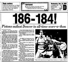 A partida com mais pontos de sempre, 370, aconteceu a 13 de dezembro de 1983 com os Detroit Pistons a derrotarem os Denver Nuggets por 186-184, após três prolongamentos. Os 186 pontos dos Pistons é também o máximo de uma só equipa.
