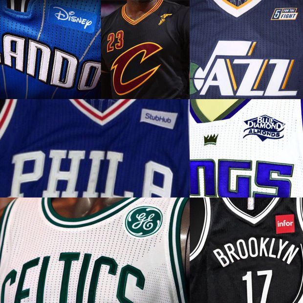 Em 2014/15, a Liga decidiu retirar o logótipo da NBA que, há mais de quatro décadas, existia na parte superior esquerda das camisolas para recoloca-lo nas costas, por cima do nome dos jogadores. Começava a ser criado o espaço para o surgimento de patrocínios, ainda que, na altura, os responsáveis tenham justificado que se tratava apenas de uma «medida estilística». Os clubes que já foram campeões passaram a ter um pequeno quadrado dourado nas costas, no centro do debruo, com o número de vezes que ganharam o título. A NBA havia sido a primeira das quatro grandes ligas desportivas do norte da América a, em 1969, ter colocado o seu logo nas camisolas de jogo.