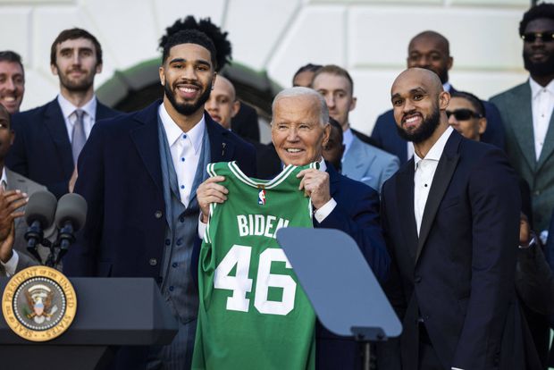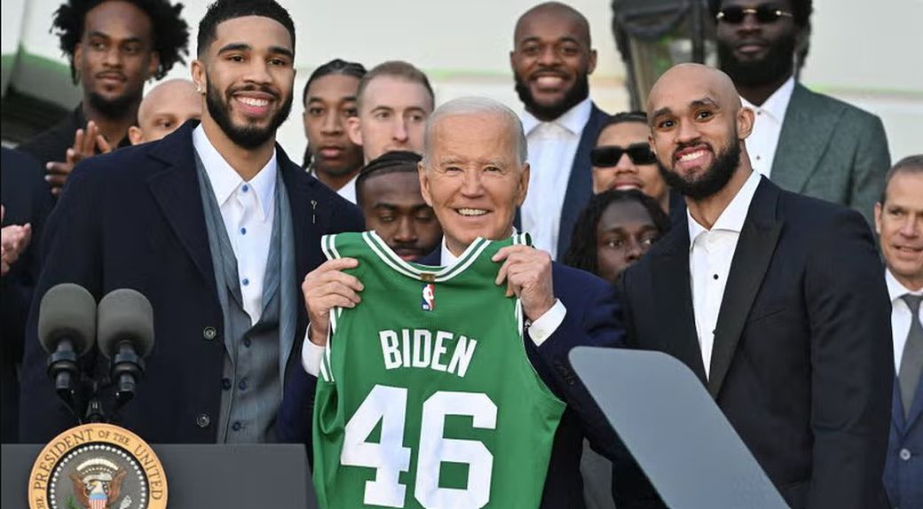 Joe Biden, de 82 anos, contou igualmente que brincou com Joe Mazzulla por ele ter sido o treinador mais jovem de sempre a conquistar um título da NBA, então com 35 anos, desde que Bill Russell o conseguira em 1969. «Disse-lhe que costumava ser o mais novo [senador, um dos mais jovens a terem sido eleitos] e agora sou o mais velho [presidente]. Gostei mais de ser o mais novo.»