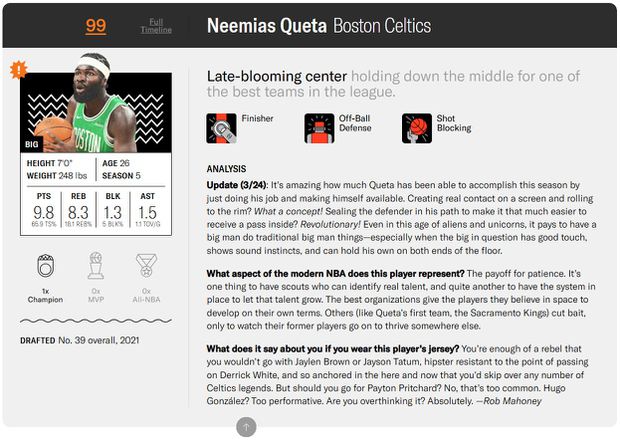 O poste português, de 26 anos, é descrito como um atleta que «se destacou tardiamente e que agora é o pilar central de uma das melhores equipas da liga», aparecendo no 99.º lugar entre os melhores jogadores da época. Na liga norte-americana estão mais de 450 jogadores entre as 30 equipas que a compõem.