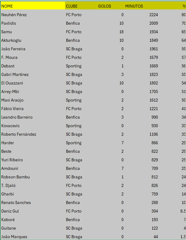 Nehuén Pérez é quem tem mais minutos (2224) entre os contratados por Sporting, Benfica, FC Porto e SC Braga, Samu Aghehowa é o maior goleador (18) e Zeki Amdouni é quem precisa de menos minutos para marcar um golo (101).